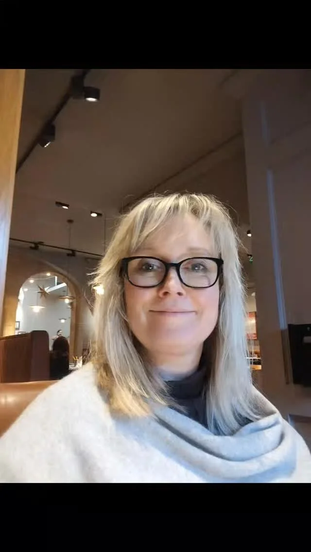 Woman with blonde hair and glasses smiling, standing next to an open green vehicle, holding a large newspaper or flyer.